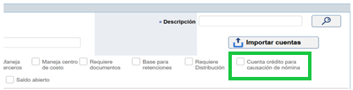 Se determina que el campo Cuenta crédito para el comprobante de causación de nómina estará disponible en la pantalla de cuentas con una nueva marcación Cuenta crédito para causación de nómina.