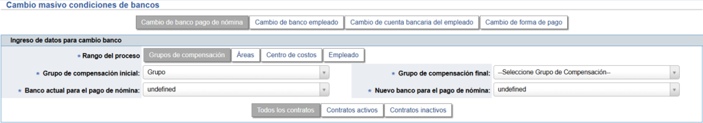 • Se ha corregido el comportamiento del paginado y se asegura que la selección del campo Banco actual para el pago de nómina se conserve al cambiar entre las opciones de radiobutton: Todos los contratos, Contratos activos y Contratos inactivos.