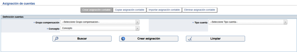 1. El primero es el Origen y Destino de la copia de la asignación de cuentas. Los controles son Grupo de compensación origen sin selección múltiple y Grupo de compensación destino con selección múltiple. La siguiente línea es la agrupación contable que tenga el grupo de compensación origen sin selección múltiple y agrupación destino con selección múltiple.