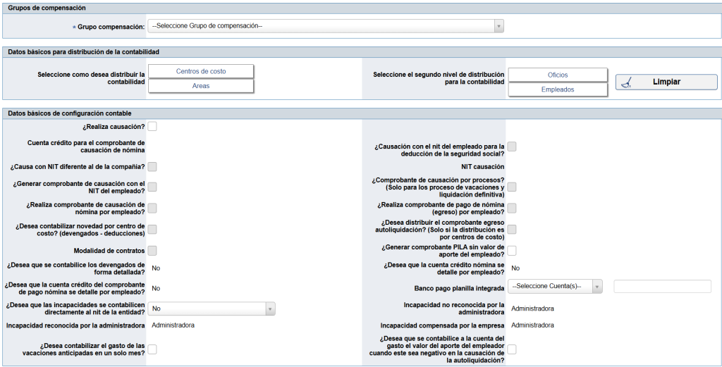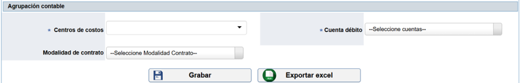 b. Si la agrupación contable es Áreas: Oculta los campos de segundo nivel para la contabilidad y la línea de novedad por centro de costos y Modalidad de contratos.