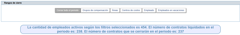 5. Se adiciona a la pantalla un mensaje donde indica la cantidad de empleados activos, contratos liquidados en el periodo seleccionado y cantidad de empleados que se van a cerrar en el periodo seleccionado según el rango de cierre.