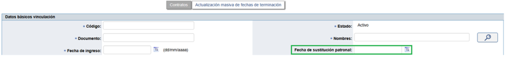 • En el contrato campo Fecha de sustitución patronal se debe establecer el día a partir del cual el contrato pertenecerá al nuevo NIT; esto permite ingresar en el campo Fecha de ingreso el valor real del inicio de labores conservando la antigüedad del empleado para los procesos que así lo requieran.