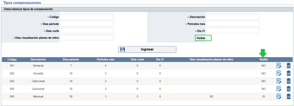 En la pantalla de tipos de compensación se crea nuevo control de tipo marcación o checkbox llamado visible para permitir la funcionalidad de mostrar u ocultar los tipos de compensación configurados por pantalla. Esta función se aplica tanto en las operaciones de modificación como de inserción de datos.