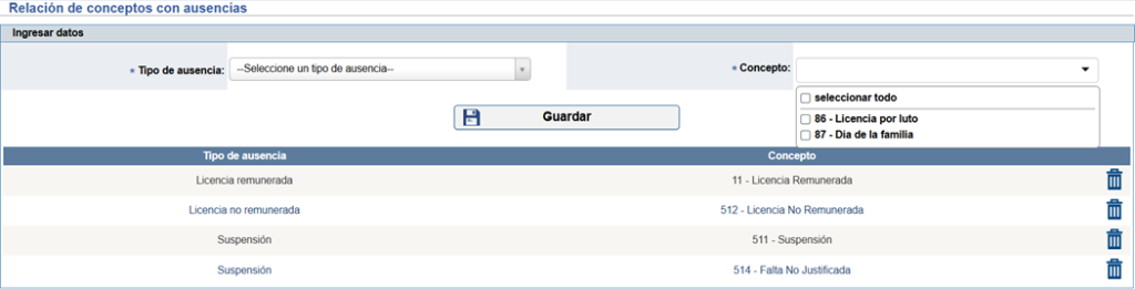 4. Cuando la configuración este guardada, podrá ir a la pantalla de ausencias y en la lista desplegable de conceptos podrán ver el concepto relacionado a la ausencia.