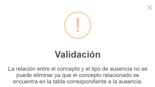 Tenga en cuenta que no es posible eliminar la relación cuando exista una ausencia ingresada con la asociación que se desea eliminar. La validación que se presenta es:
