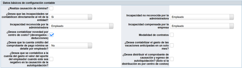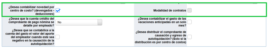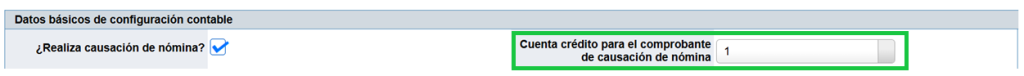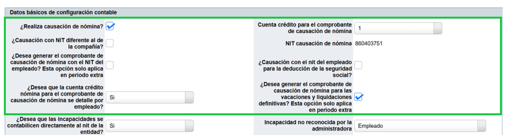 c. Al marcar ¿Realiza causación de nómina? habilita los campos resaltados en color verde.