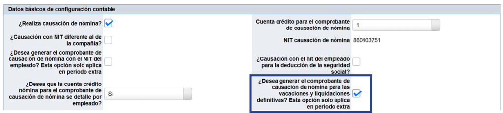f. Marcación ¿Desea generar el comprobante de causación de nómina para las vacaciones y liquidaciones definitivas? Esta opción solo aplica en periodo extra. Solo habilitará los campos de configuración de comprobantes contables cuando exista marcación, de lo contrario no lo mostrará.