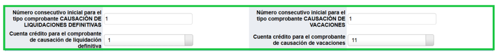 Para las etiquetas de número consecutivo inicial para el tipo de comprobante CAUSACIÓN DE LIQUIDACIONES DEFINITIVAS y número consecutivo inicial para el tipo de comprobante CAUSACIÓN DE VACACIONES se agrega la opción para seleccionar la cuenta contable utilizando la misma marcación Cuenta crédito para causación de nómina ubicada en la pantalla de cuentas. En caso de existir varias cuentas con la marcación se presentará una lista desplegable para seleccionar la cuenta contable requerida en caso contrario solo un control de texto con la única cuenta contable configurada.