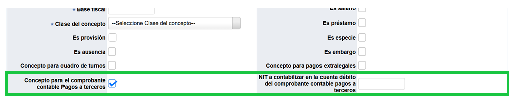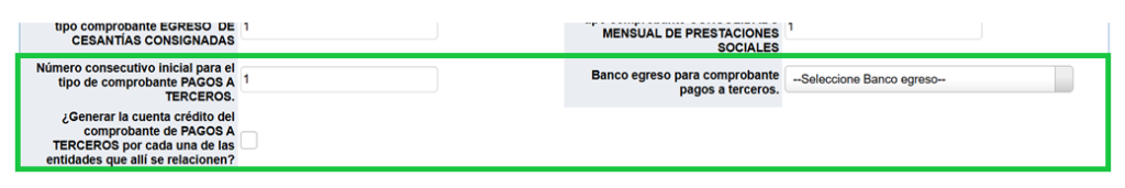 Se condiciona la marcación Concepto para el comprobante contable pagos a terceros de la pantalla de conceptos para que habilite en la pantalla de definición contable los campos de ¿Generar la cuenta crédito del comprobante de PAGOS A TERCEROS por cada una de las entidades que allí se relacionen?, Número consecutivo inicial para el tipo de comprobante PAGOS A TERCEROS y Banco egreso para comprobante pagos a terceros y realizar su respectiva configuración.