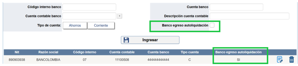 • Se crea una nueva marcación en la pantalla de bancos llamada Banco egreso autoliquidación, la cual reemplaza el proceso de selección que se deba en la pantalla de definición contable para el banco que usa para el pago de la seguridad social. Esta opción permitirá que, en la gestión contable en el proceso de Egreso de autoliquidación, el sistema muestre los bancos que contengan la marcación. Si existen varias bancos con la marcación, se presenta una lista desplegable para seleccionar por cual banco se realizó el pago de la seguridad social. En caso de ser solo una marcación, se muestra un único campo de texto con la cuenta banco configurada. Eso quiere decir, que si se requiere cambiar de banco y no se visualiza en el campo debe ir a la pantalla de Bancos para realizar la configuración.