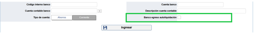 2. En la pantalla de bancos se crea un campo de selección en el bloque de configuración Egreso para que se realice la marcación en caso de no existir cuenta contable guardada con anterioridad en la pantalla de definición contable.
