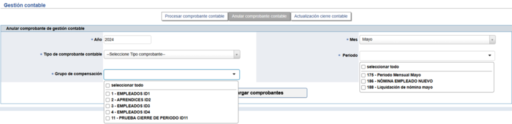 • Se crea una nueva funcionalidad de escoger más de un grupo de compensación y periodo al momento de anular. Esto para facilitar la anulación de múltiples comprobantes contables de manera simultánea. Para lograrlo, se ha utilizado un control de lista desplegable con selección múltiple, esto cuando existan varios grupos de compensación y periodos.