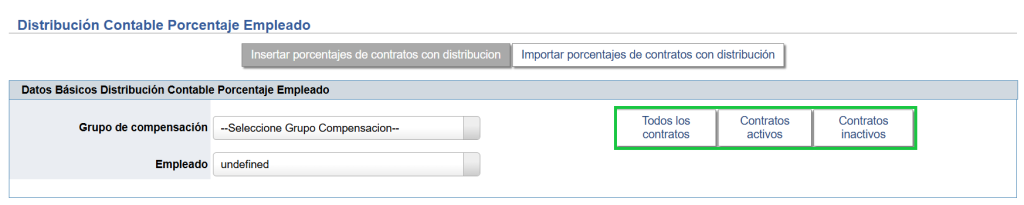 • La pantalla está ubicada en Configuración contable. En ella se agrega en la opción búsqueda del empleado filtrar por los contratos según el estado actual de su contrato: Todos los contratos/ Contratos activos/Contratos inactivos.
