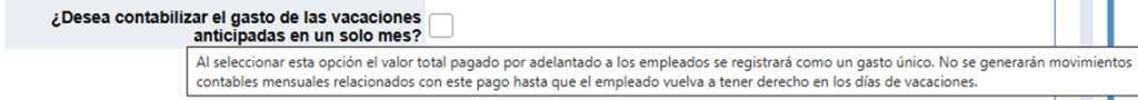 j. Actualización de los textos del campo ¿Desea contabilizar el gasto de las vacaciones anticipadas en un solo mes?