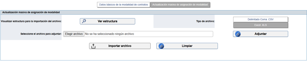 En la pantalla de modalidad, se agrega la opción de importación de asignación modalidad de contratos. El manejo de la importación es el proceso habitual conocido en las diferentes importaciones.